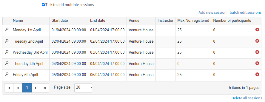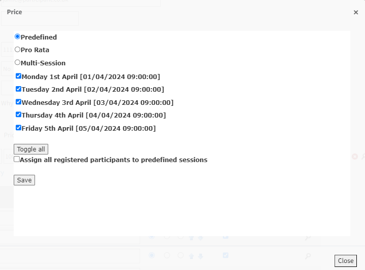 Step 3: Option 1. If you wish for the sessions to be set by default, link them by using the Predefined option and then tick the relevant sessions. On the below example, the 'All 5 days' option is linked to all the sessions by clicking the spyglass icon.