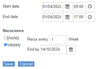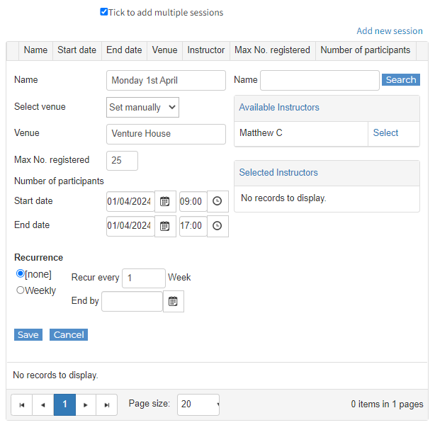 If your sessions recur on the same day and time every week, e.g., every Monday from 9am to 5pm, you can set the "Recurrence" to "Weekly" and then enter the "End by" date. This will add a session every day between the first date, and the "End by" date set.