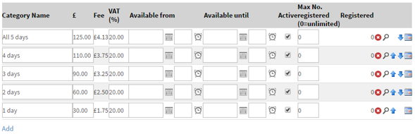 In this example, the price is £30 per day, but for a 4-day booking a £10 discount is offered, and for a 5-day booking a £25 discount is offered.