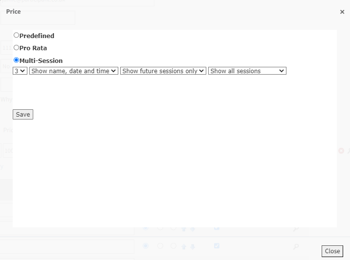 Step 3: Option 2. Alternatively, if you wish for the participant to be able to select the number of days, please mark your price options as "Multi-Session" by clicking the spyglass icon. Select "Multi-Day" and choose the number of sessions they have to pick.