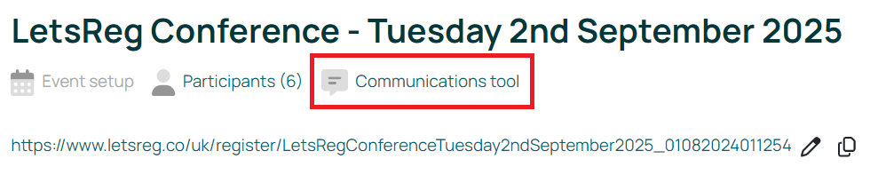 To access this tool, please click on "Communications tool" from your event setup page.