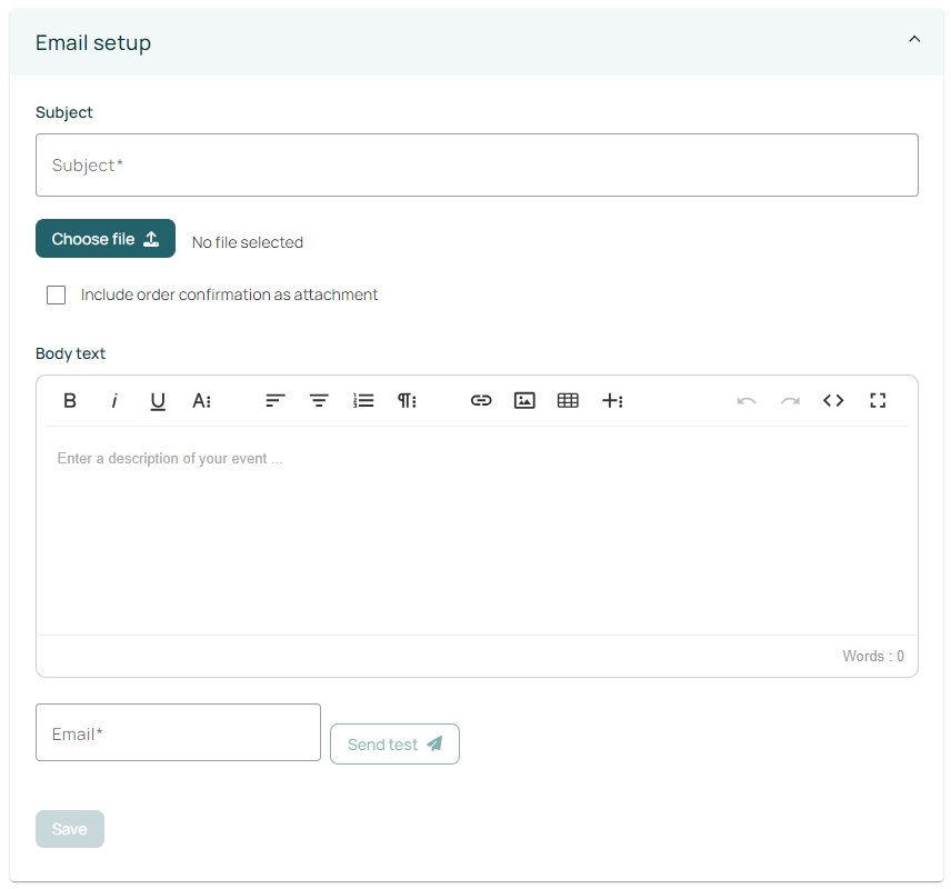 In the email setup, you can enter a subject line and body text, with the option to attach files if required. You can also send a test email to check the contents of the message, if you wish.