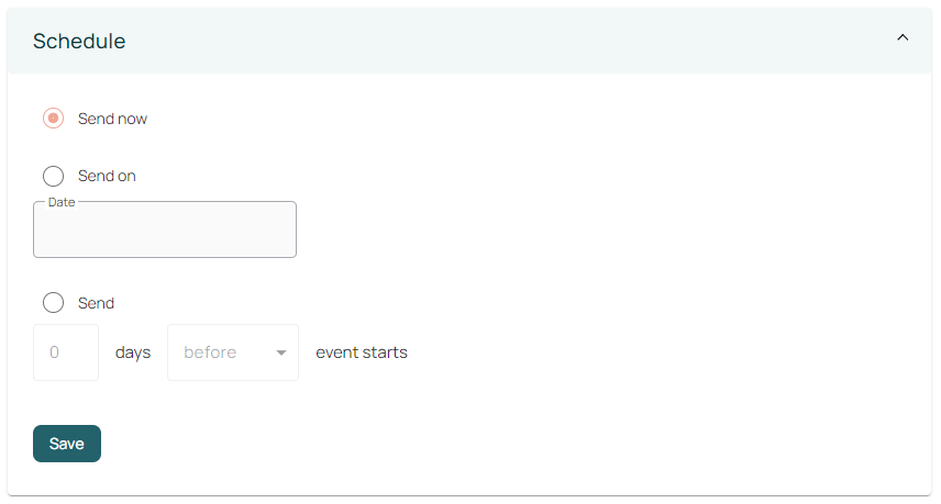You can either send the email immediately, schedule it to be sent on a predetermined date or time, or alternatively, you can set it to send a number of days before or after the event has taken place.