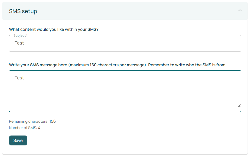 In the SMS message setup, you can enter a subject line and body text. The system will show you the number of remaining characters for the text message; if you surpass this, it will create multiple SMS messages.