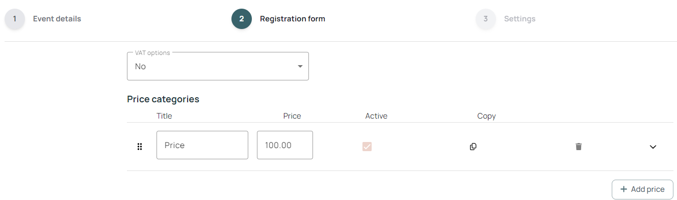 13. Here, you can set your price and add multiple price categories if needed. You can also select the relevant VAT option.