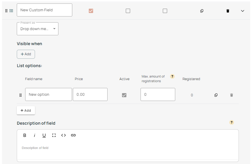 17. If you are adding list options, you can enter these by clicking on the downwards arrow to expand the question box. New fields can be added by clicking on Add.